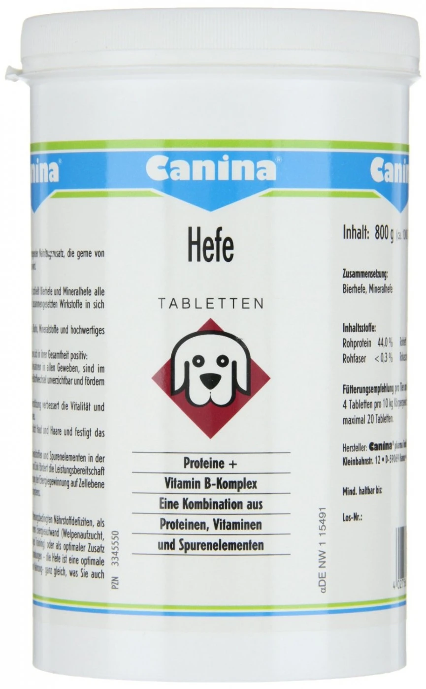 Neben der eigentlichen Ernährung von Hunden durch Nass- oder Trockenfutter spielt auch die Nahrungsergänzung im umfangreichen Zooheld-Sortiment eine große Rolle, wobei der renommierte deutsche Hersteller Canina Pharma mit sehr vielen verschiedenen Ergänzungsfuttermitteln stark vertreten ist. Die Hefe Tabletten, die wir Ihnen hier in der 800 g Dose günstig anbieten, bieten eine Mischung aus Bierhefe und Mineralhefe und versorgen Ihren Hund über die normale Nahrung hinaus mit Proteinen, Vitaminen und Spurenelementen. Das Produkt dient dem Ausgleich von fütterungsbedingten Nährstoffdefiziten sowie als Unterstützung bei erhöhtem Energiebedarf, etwa bei körperlichem und mentalem Training oder in der Welpenaufzucht. Auch der Einsatz während oder nach Erkrankungen hat sich bewährt. In dem reinen Naturprodukt, das außer als wohlschmeckender Nahrungszusatz auch als Appetitanreger eingesetzt werden kann, sind sämtliche wichtigen Wirkstoffe enthalten, für die Hefen bekannt sind: sämtliche Vitamine der B-Gruppe, Biotin, Mineralstoffe sowie hochwertiges Eiweiß. Von den genannten B-Vitaminen weiß man seit langem, dass sie sich in ihrer Gesamtheit synergetisch positiv ergänzen: Sie übernehmen eine wichtige Rolle als Katalysatoren in allen Geweben, sind unverzichtbar im Kohlenhydrat- & Eiweißstoffwechsel und fördern die Zellteilung. Insgesamt tragen sie zu einer Verbesserung der Vitalität und der Funktion der Nervenstränge bei. Als wahre Alleskönner sind sie auch am Schutz der Haut und an der Festigung der Krallen beteiligt. Damit nicht genug, denn Hefen bewirken auch eine Stärkung des Immunsystems und fördern durch den hohen Gehalt an Mineralstoffen und Spurenelementen wie z.B. Calcium und Zink die Leistungsbereitschaft, weil dies die Energiegewinnung auf Zellebene anregt.