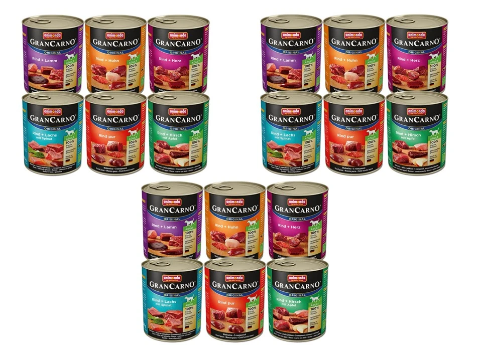 Wie Sie sehen, bietet Ihnen diese Testpackung bereits sechs unterschiedliche Geschmacksrichtungen mit jeweils sehr hohen Fleischanteilen und gesundheitsfördernden pflanzlichen Komponenten. Wenn Sie Ihren Hund selbst entscheiden lassen möchten, welche Sorten Animonda GranCarno er besonders bevorzugt, bestellen Sie unser zweites Multi-Pack bei Zooheld gleich mit! Das zweite Multipack enthält die Sorten Animonda GranCarno: