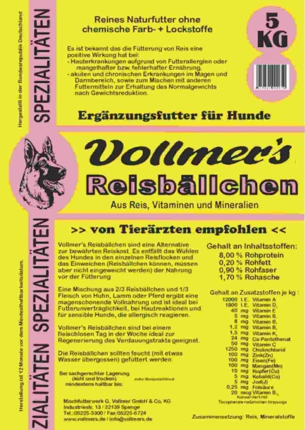Die Vollmer´s Reisbällchen, die Zooheld Ihnen im 5 kg Sack nach Hause liefert, sind ein glutenfreies Ergänzungsfuttermittel für Hunde, das neben Reis noch Vitamine, Mineralien und Spurenelemente in einem ausgewogenen Verhältnis enthält – die genaue Zusammensetzung der Bällchen können Sie unter Details nachlesen, wenn Sie genau wissen wollen, was Sie Ihrem Hund anbieten. Der Einsatz von Reis als leicht verdaulicher und glutenfreier Kohlenhydratquelle in der Hundefütterung hat sich vor allem dann bewährt, wenn es um eine effektive Gewichtskontrolle geht oder bei fütterungsbedingten Erkrankungen. Insbesondere ist bekannt, dass Reis in der Ernährung eine positive Wirkung ausübt, wenn Erkrankungen der Haut und des Magen-Darmbereichs vorliegen, die aus Futtermittelallergien resultieren. In solchen Fällen, die in den letzten Jahren leider deutlich zugenommen haben, ist eine allergenarme Kost zu verabreichen, in der alle möglichen Allergieauslöser eliminiert werden, wozu Reis in der Regel nicht gehört. Was die Fütterung der Vollmer’s Reisbällchen angeht, sind diese auch hervorragend geeignet zum Mischen mit anderen Futtermitteln zur Erhaltung des Normalgewichts nach einer Gewichtsreduktion. Weiterhin haben sich die Reisbällchen bewährt bei der Regenerierung des Verdauungstrakts, wenn man sie gelegentlich an fleischlosen Tagen verfüttert. Eine sehr magenschonende Kost erhält man, wenn man seinem Hund eine Mischung aus 3 Teilen Vollmer’s Reisbällchen und einem Teil Fleisch vom Huhn, Lamm oder Pferd anbietet. Neben der hohen Verdaulichkeit haben die Reisbällchen Ihrem Hund noch weitere gesundheitliche Vorteile zu bieten, denn sie enthalten auch den bewährten Bio-Vital-Komplex PLUS, dessen bewährte Nährstoffe den gesamten Bewegungsapparat unterstützen. Abschließend wollen wir noch darauf hinweisen, dass die Vollmer’s Reisbällchen eine Alternative zu Vollmer’s bewährter Reiskost darstellen, die wir Ihnen ebenfalls anbieten.